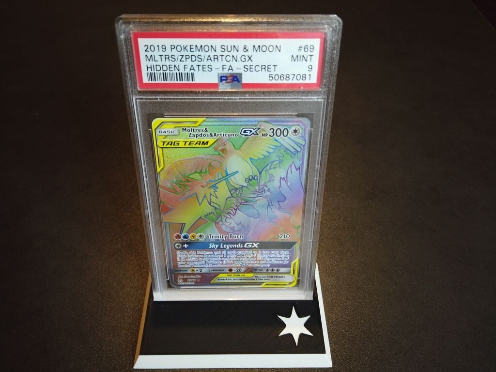 Prachtige PSA9 kaart van de Sun & Moon Hidden Fates serie, deze Rainbow Moltres & Zapdos & Articuno GX behoort tot één van de mooiste Pokémon kaarten van deze set.
